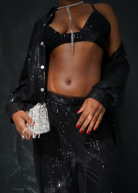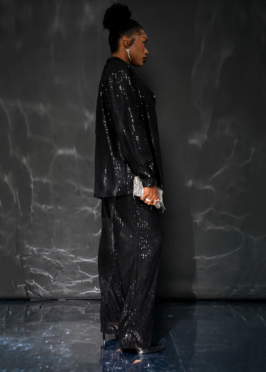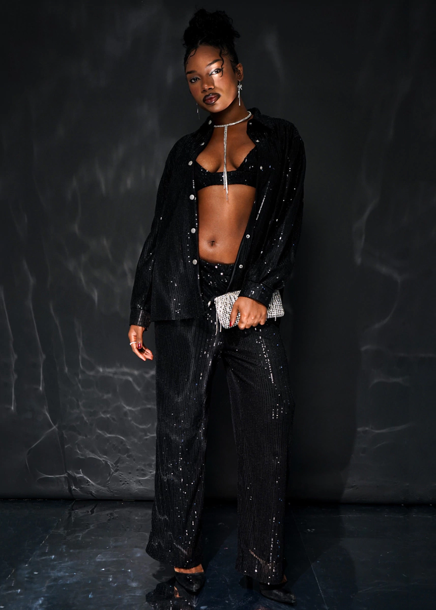 Set bordado en tu totalidad con lentejuelas negras. Cuenta con top, haciendo juego con la camisa y pantalon oversize.