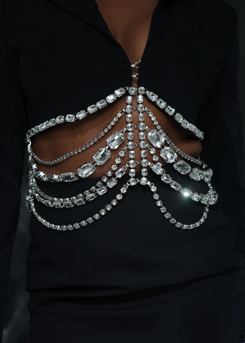 Set blazer negro corto que cuenta en su caida con piedras plateadas.