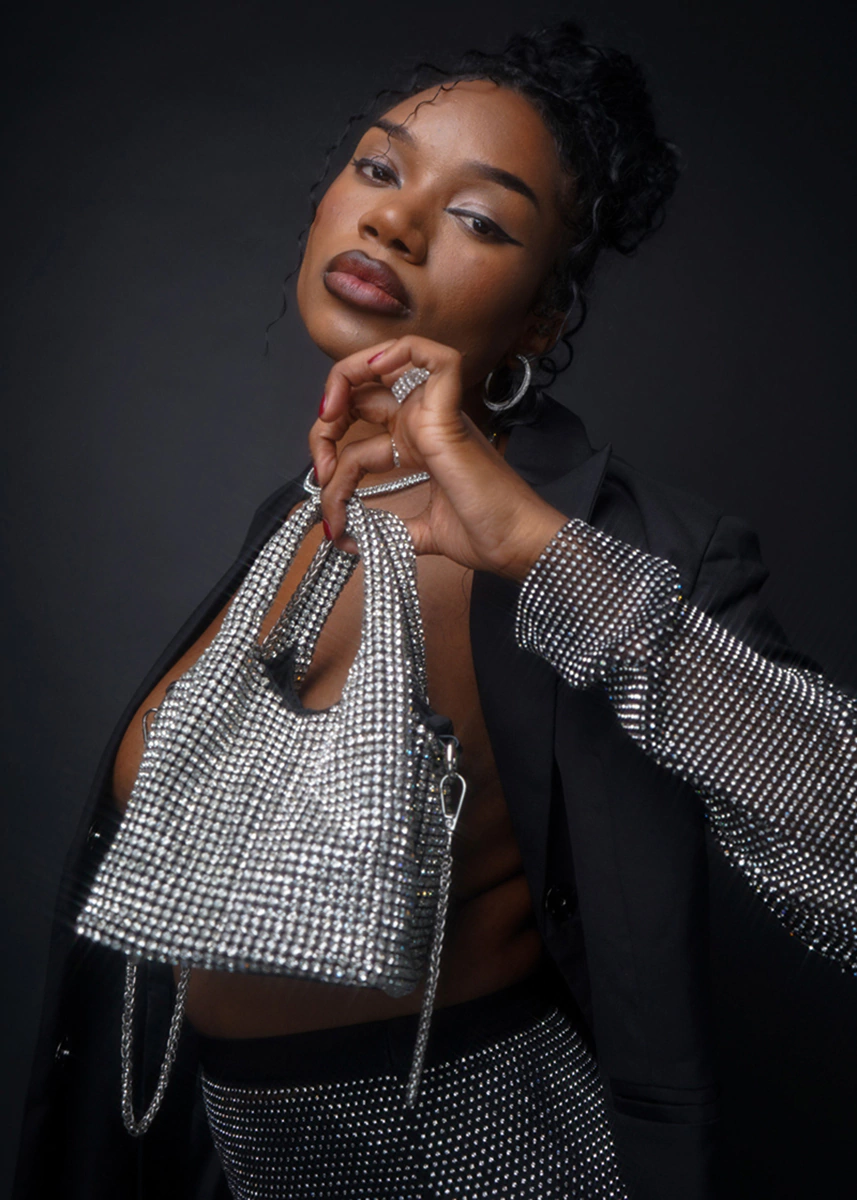Mini bag completa de piedras plateadas, se cierra con boton de iman y se puede usar como bandolera o de mano.